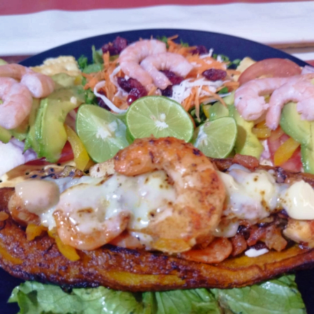 Platano relleno de mariscos con queso manchego