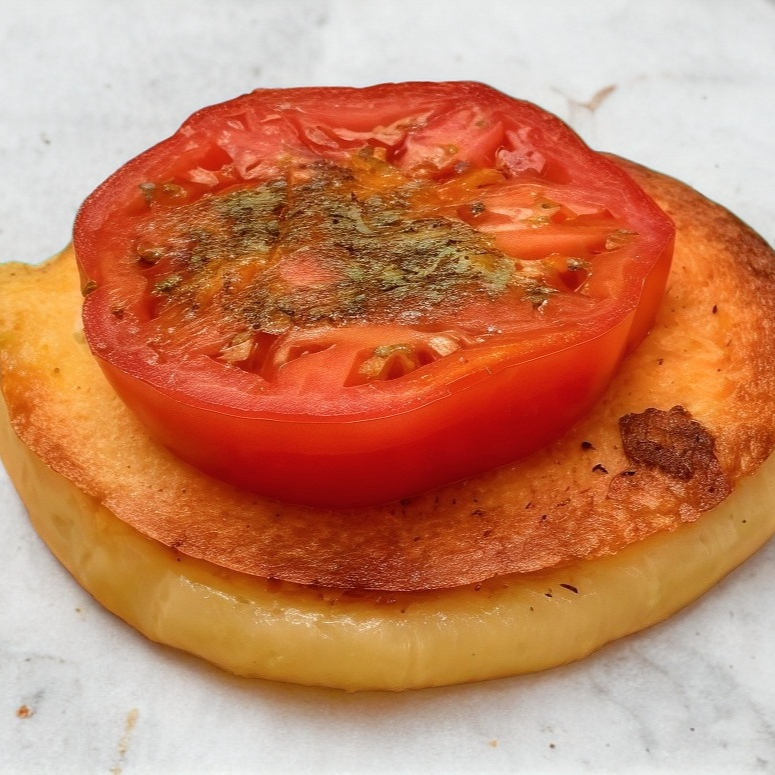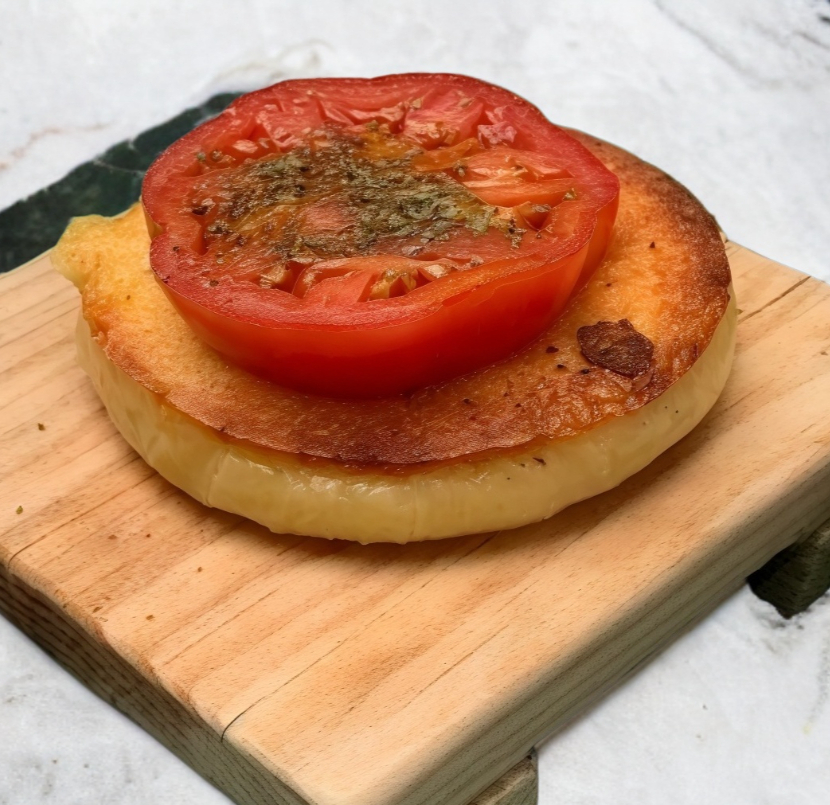 Queso provoleta a la plancha con rodaja de jitomate, perejil, orégano y aceite de oliva.