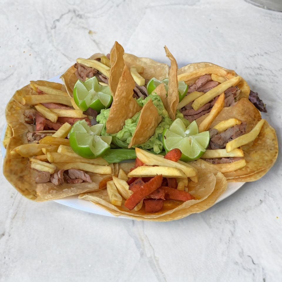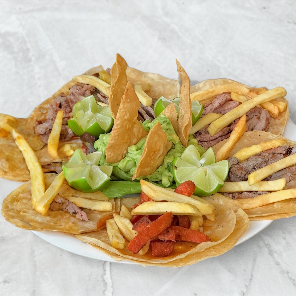 Tacos en tortilla de maiz con tu carne a elegir y papas a la francesa,