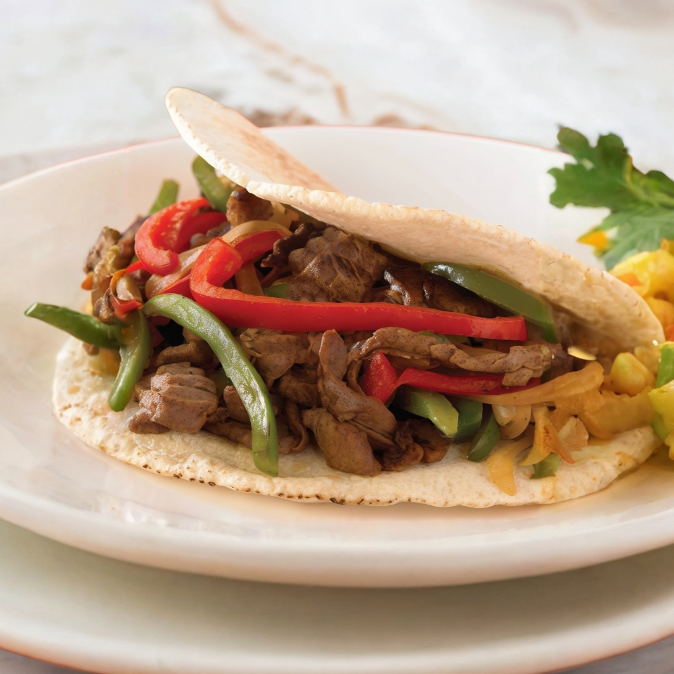 Pan árabe relleno de arrachera con cebolla y pimiento morron caramelizado.