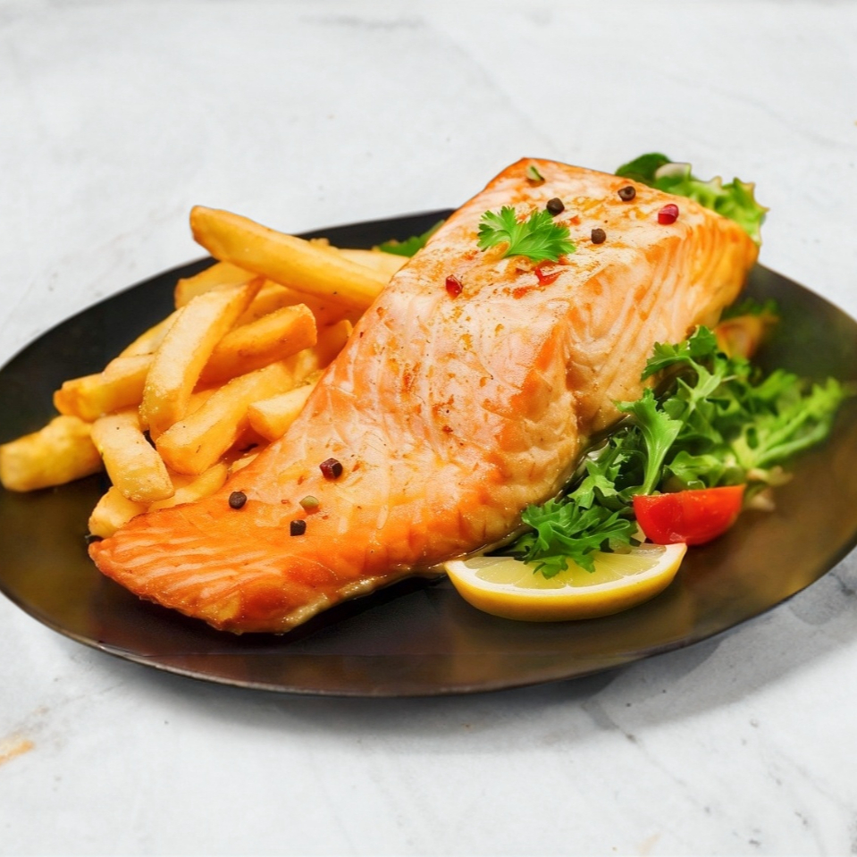 Salmón a la parrilla con papas a la francesa.