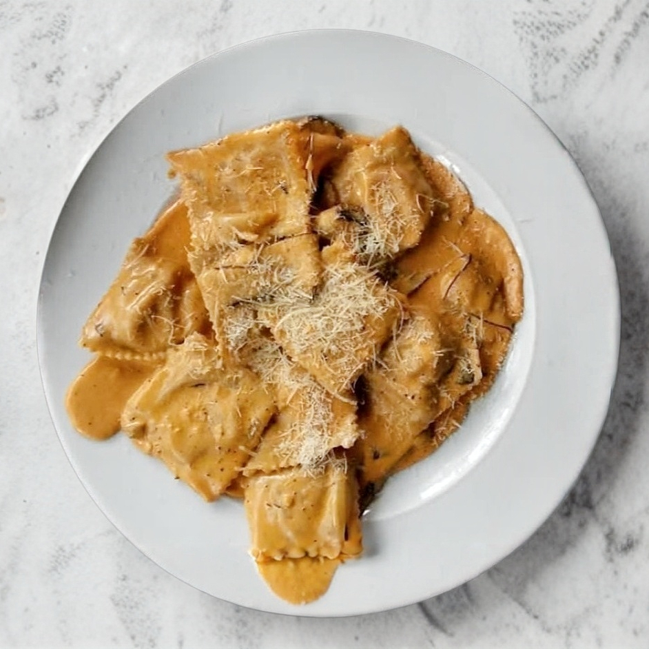 Ravioles rellenos de espinaca con salsa a elegir espolvoreados con queso parmesano.