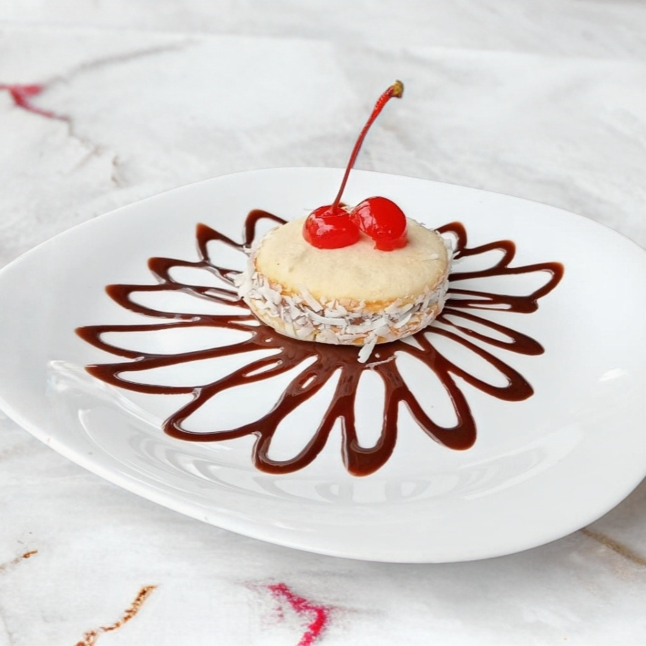 Galleta estilo polvoron rellena de dulce de leche con pizca de coco rallado