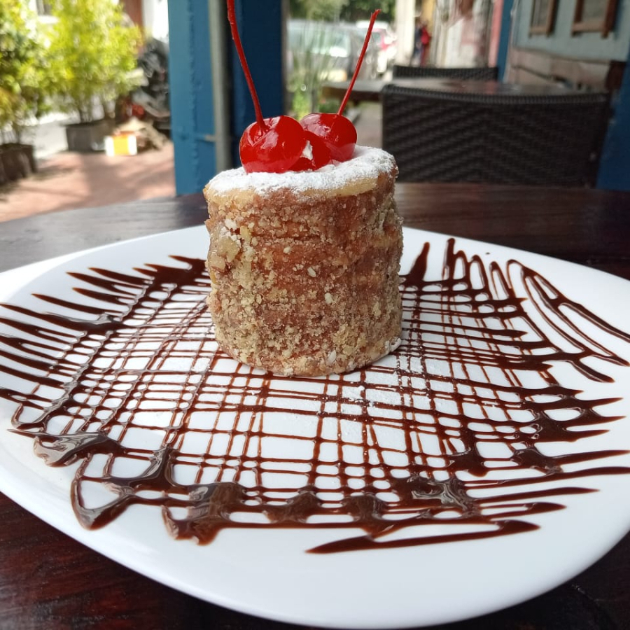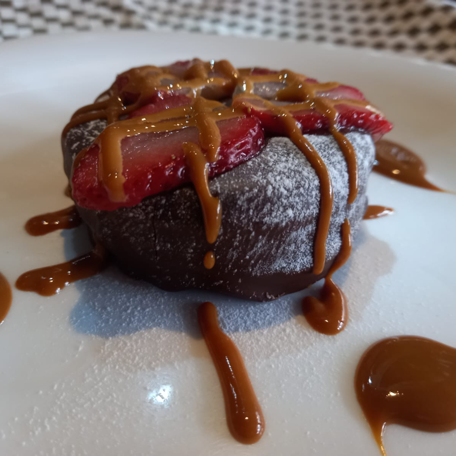 Rollo estilo crepa relleno de dulce de leche flameado con azúcar mascabado y espejo de chocolate