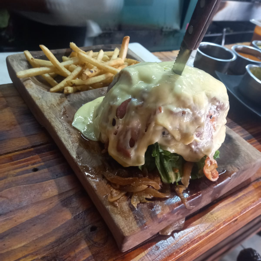 Pan artesanal con ajonjolí, 2 carnes de 120 G, dos quesos manchegos, tocino, y queso derretido por la parte de arriba, jitomate, lechuga, acompañada de papas a la francesa.