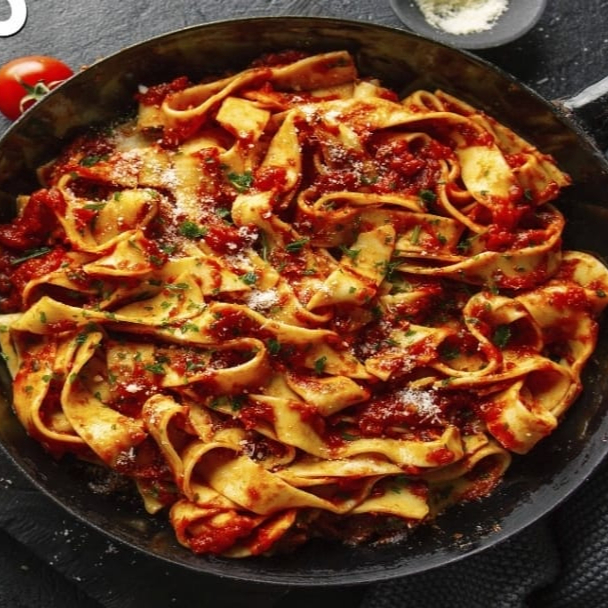 Ravioles rellenos de carne con salsa a elegir espolvoreados con queso parmesano.
