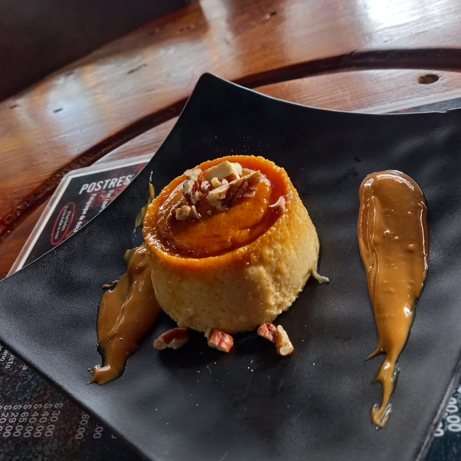 flan horneado con pizca de dulce de leche y caramelo líquido.