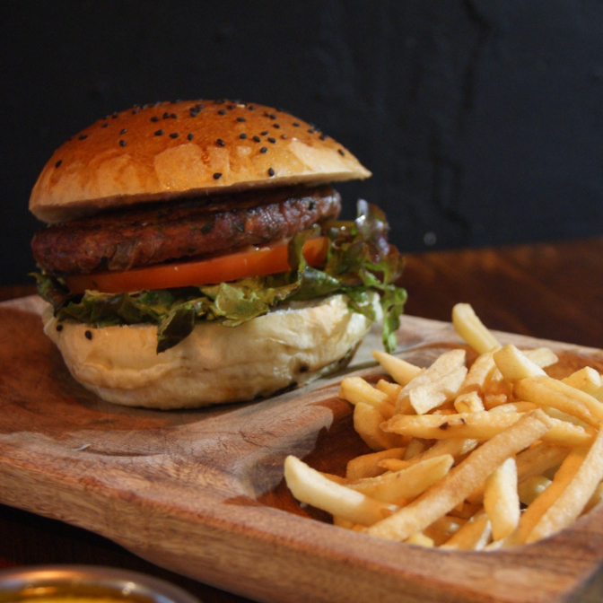 Pan artesanal carne de 120 G y queso manchego, con ajonjolí, jitomate, lechuga, acompañada de papas a la francesa.