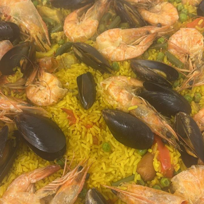 Arroz con azafrán, con carne de cerdo, pollo, pimiento morrón, salchicha mini, chorizo español, jaiba, almeja, camarones, mejillones, ejote, chicharos, alcachofa, con base de fume de pescado.