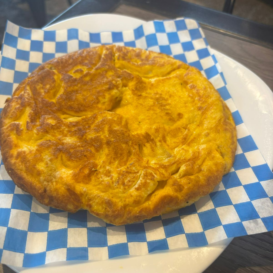 Tortilla de huevo con pimienta, papas y cebolla asada.
