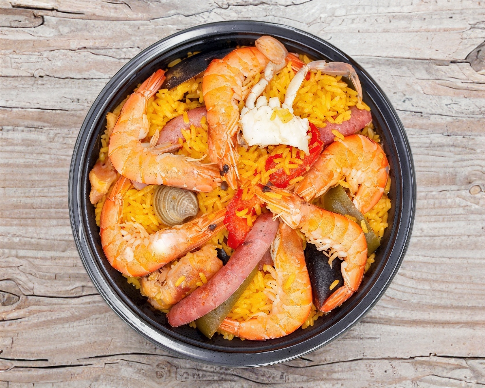 3 kilos de paella, 12 piezas de camarón grade adicional, 1 ristra de chorizo español y 3 piezas de pan
