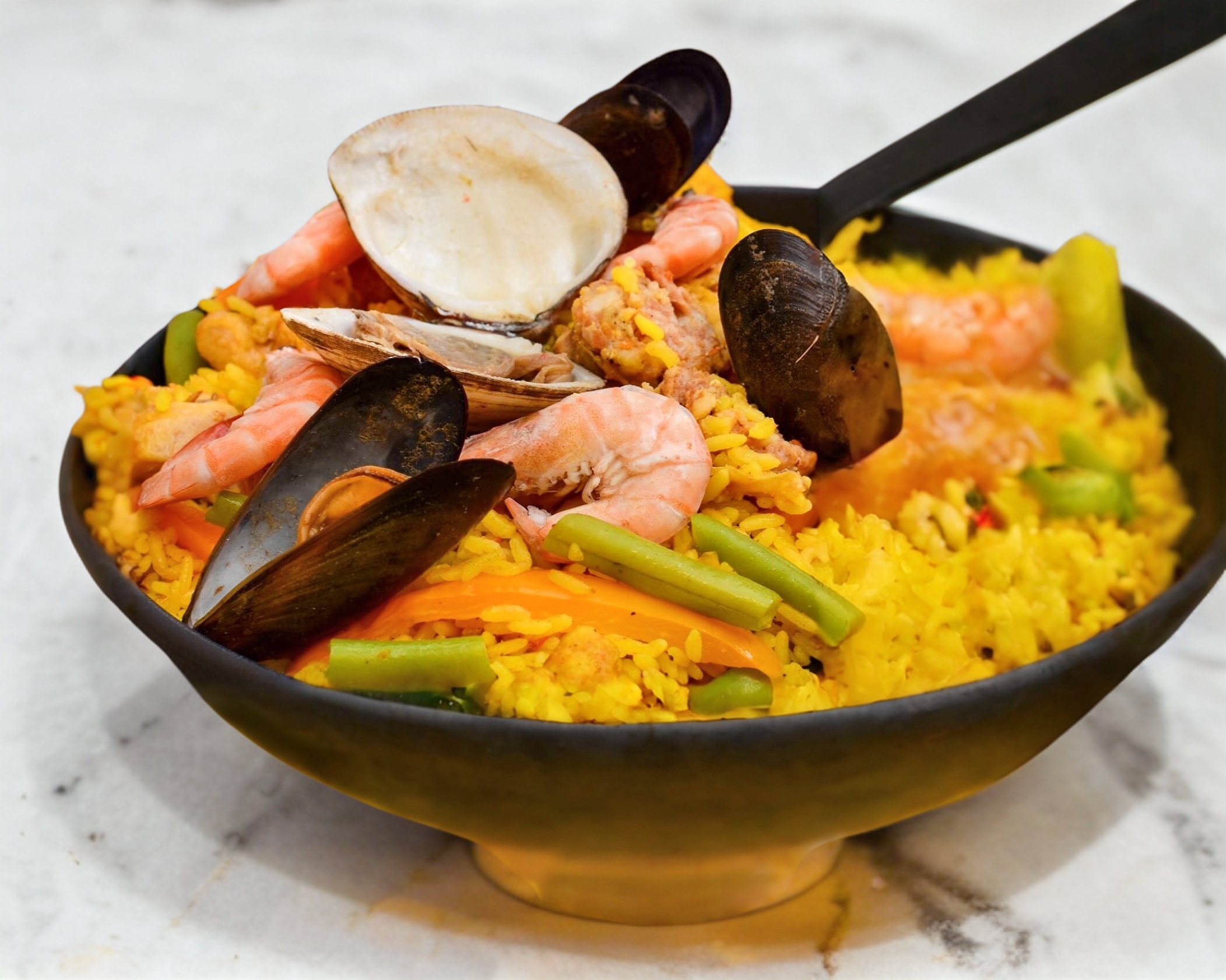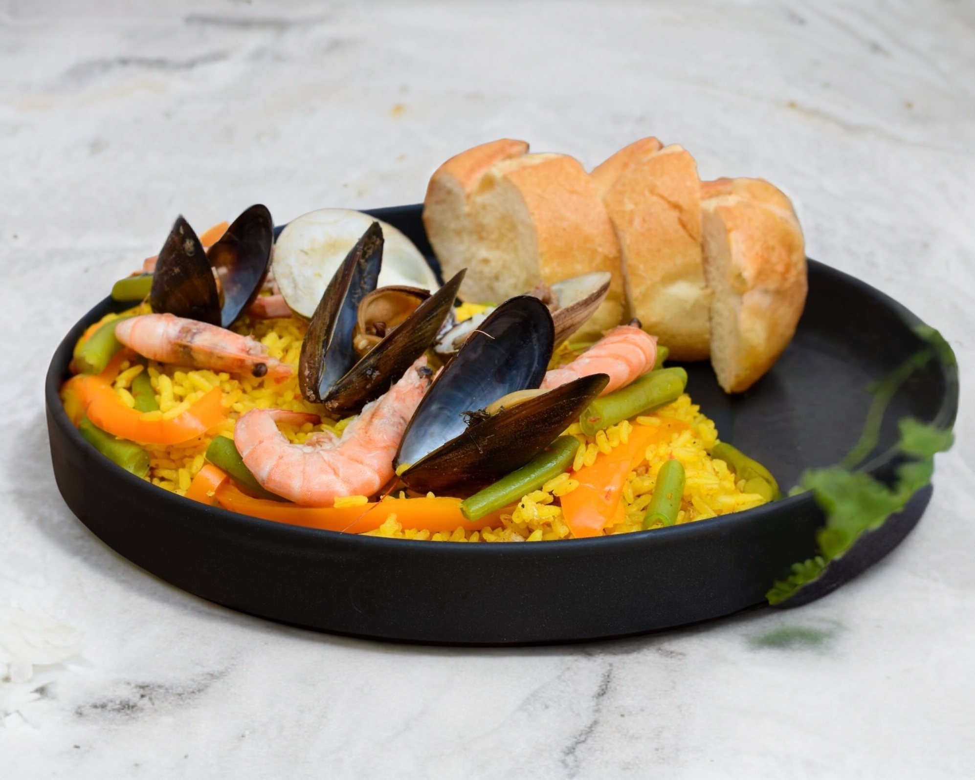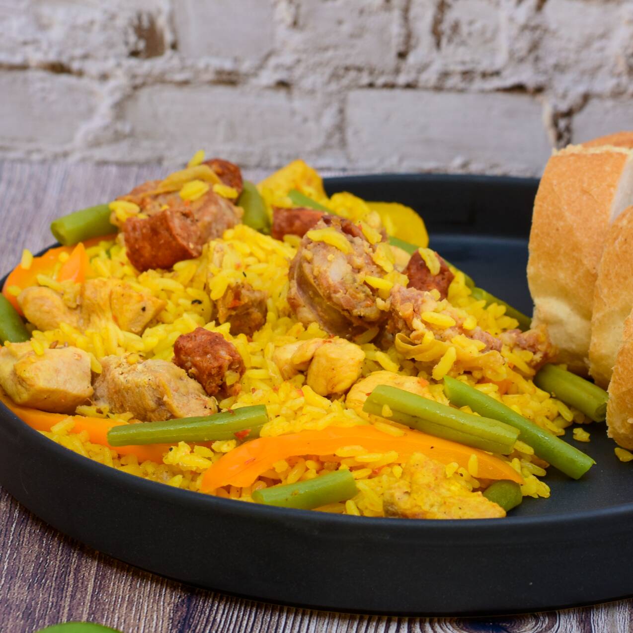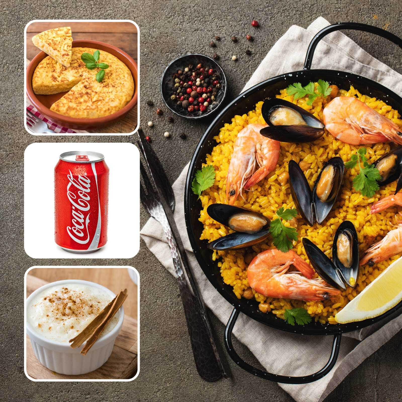Porción de 500 g. de paella a escoger: paella mixta, tierra o mar, refresco de 355 ml, porción individual de tortilla española y arroz con leche.