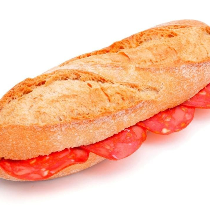 Baguette mediana de pan tumaca con chorizo de Pamplona (curado) y queso.