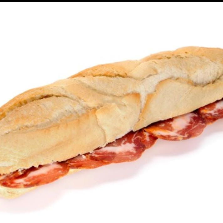 Baguette mediana de pan tumaca con lomo embuchado y queso.