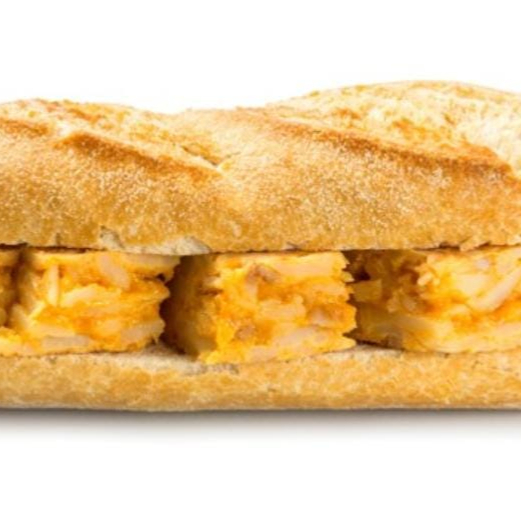 Baguette mediana de pan tumaca con tortilla española y queso.