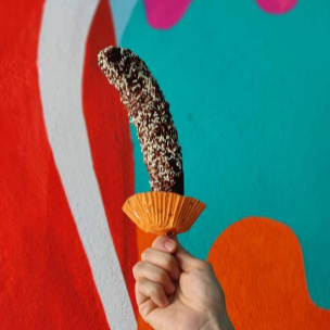 Brocheta de 4 fresas naturales congeladas cubiertas de chocolate con leche y trozos de nuez.