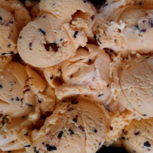 Paleta de crema con vetas de chocolate y trozos de rollo de chocolate.