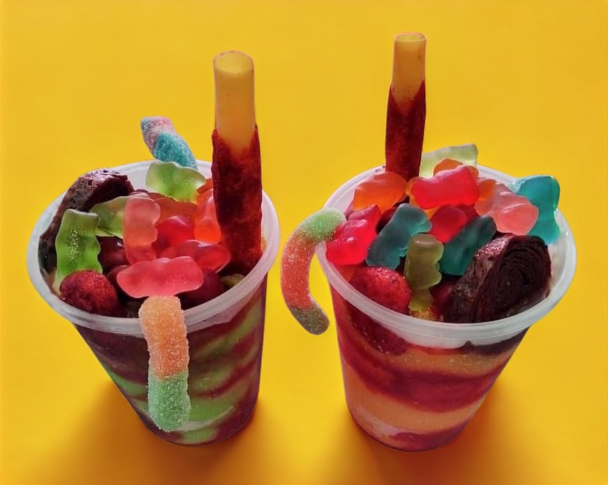 vaso de fruta natural con nieve, 12 oz, con gomitas, gomitas de chamoy, miguelito y chamoy liquido.