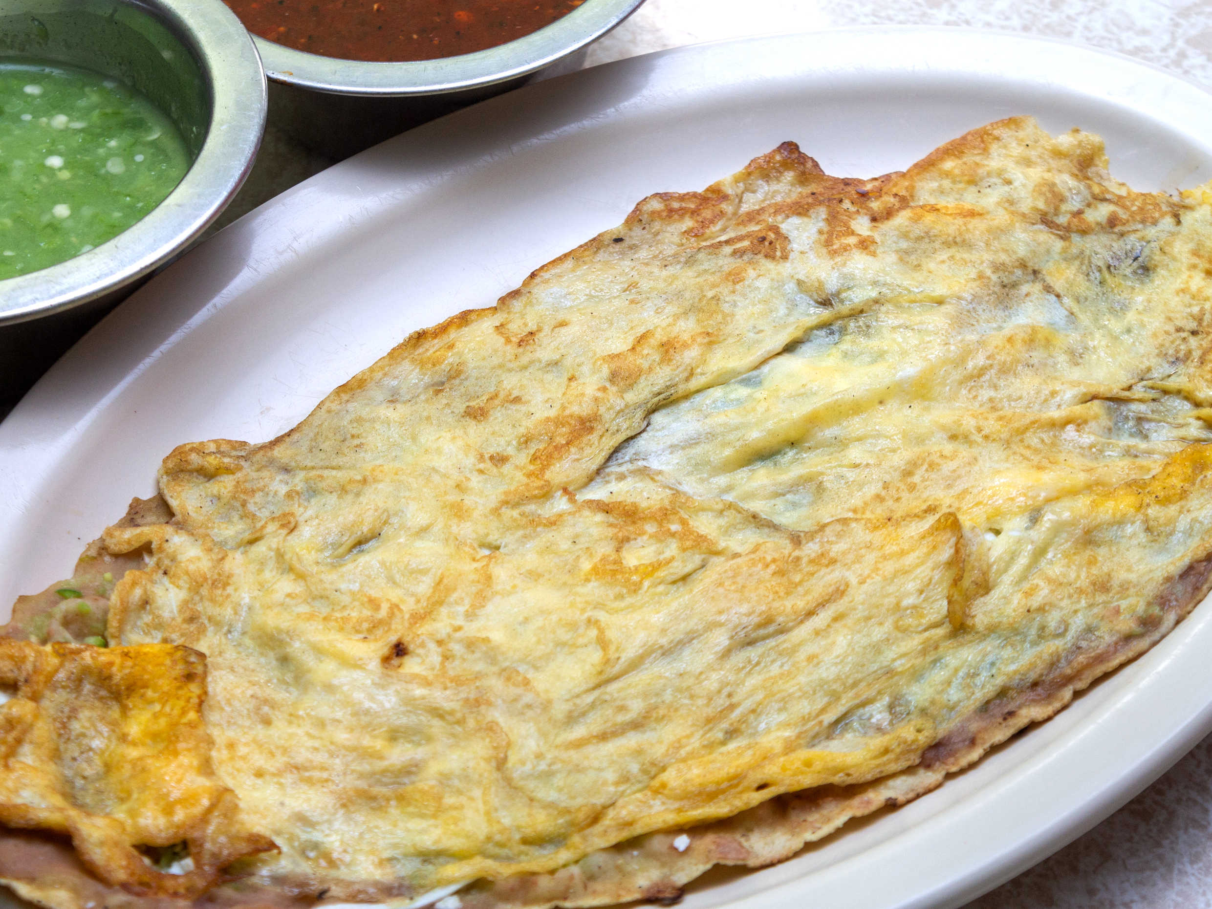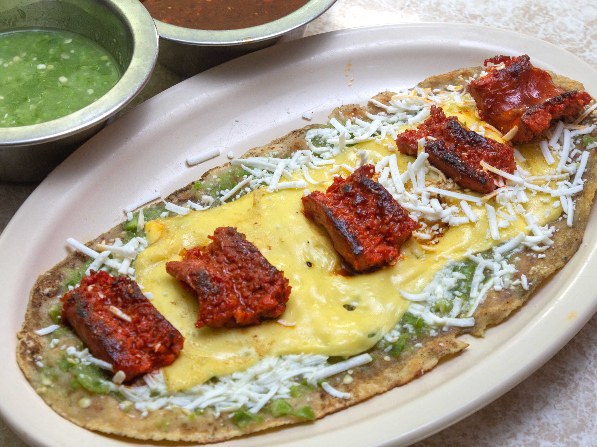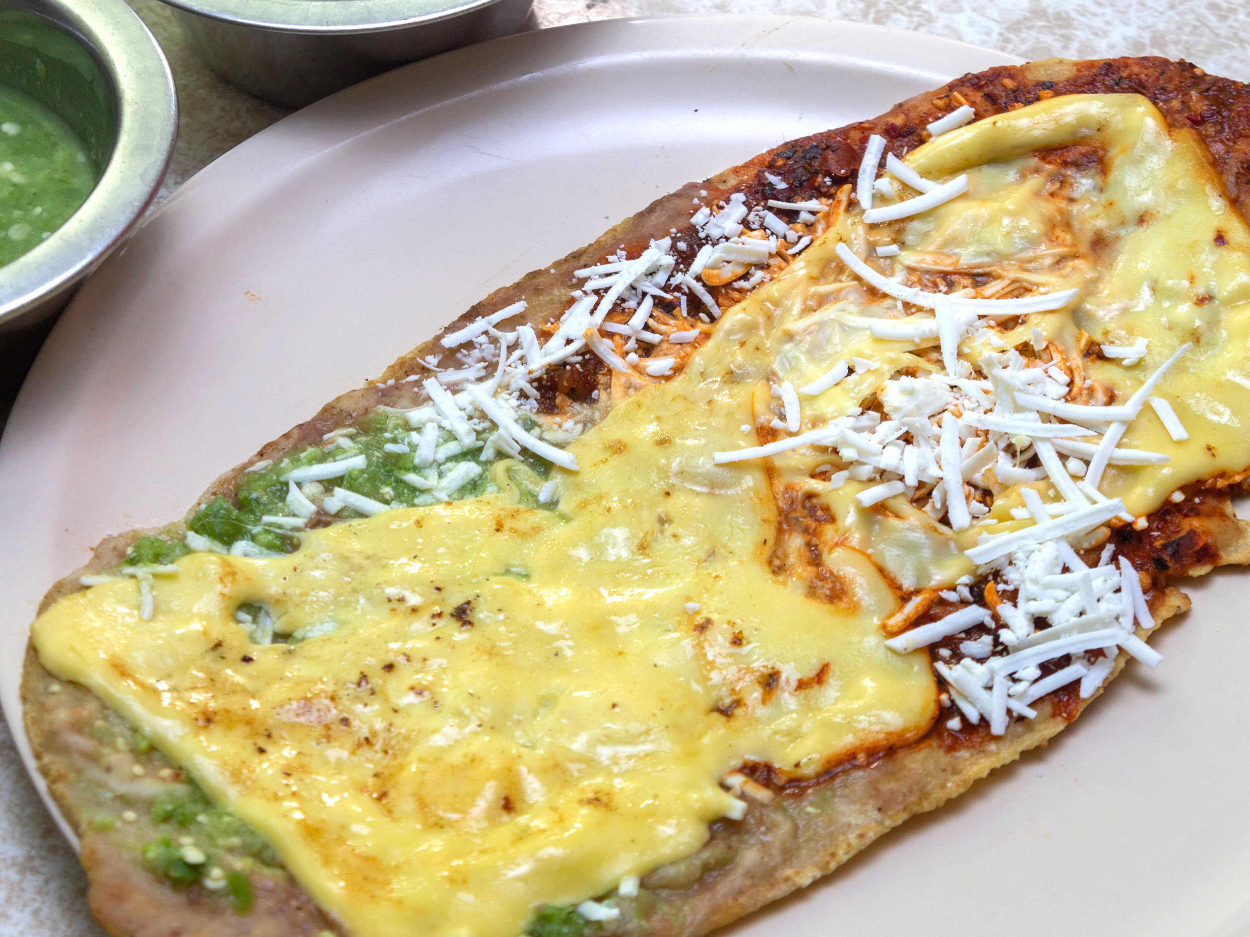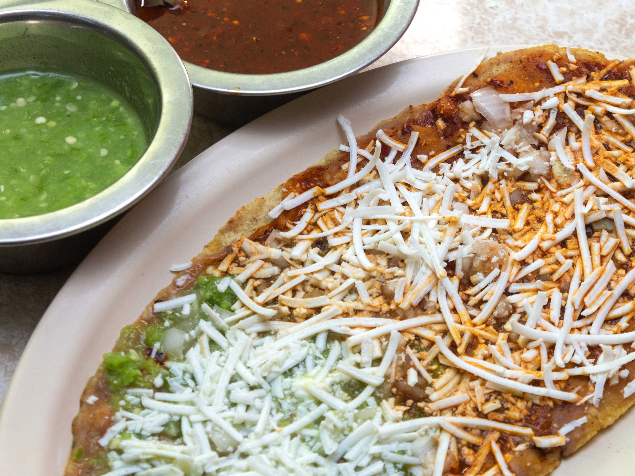 Cebolla, queso rallado, frijoles refritos, queso manchego, chistorra y salsas de la casa.