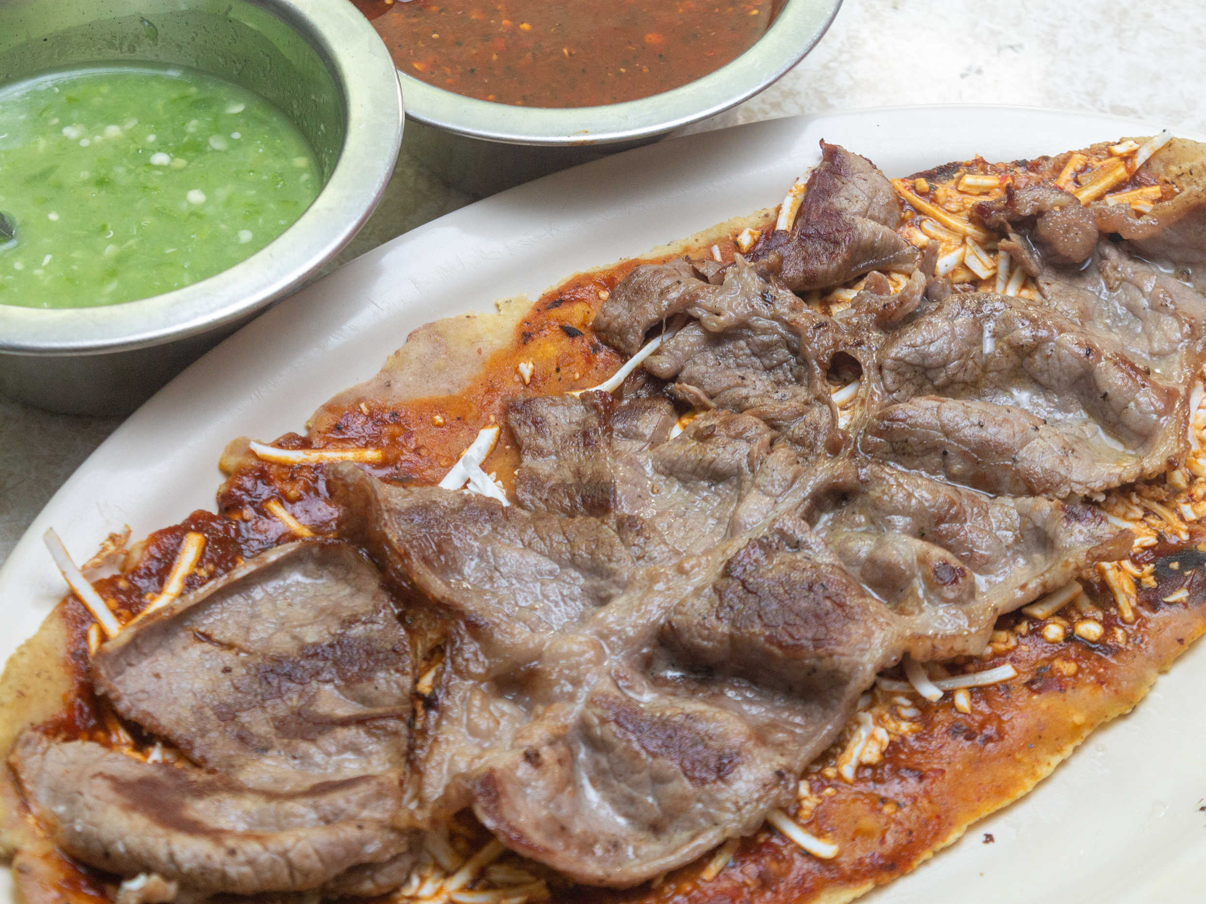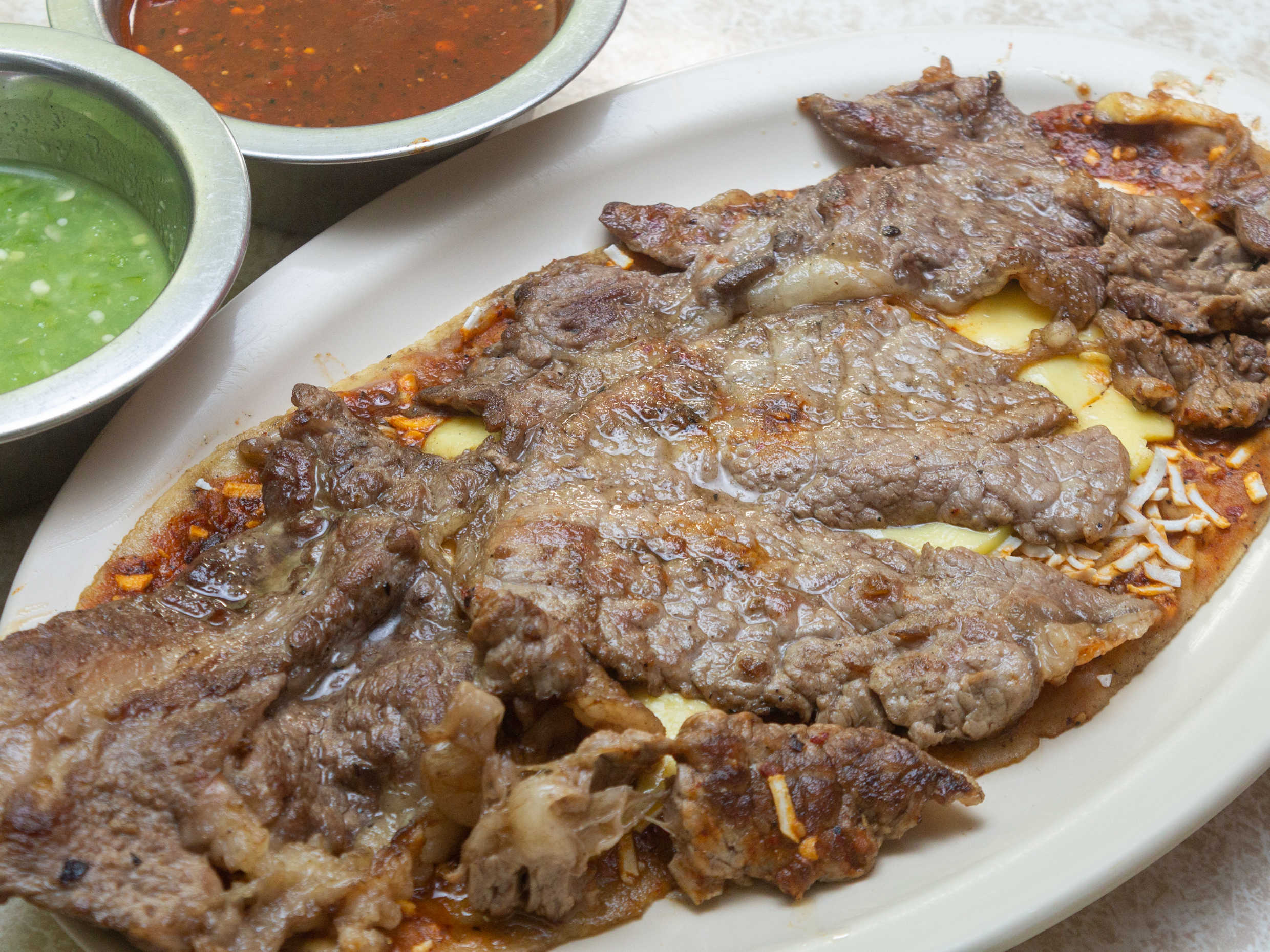 Cebolla, queso rayado, salsa, frijoles y bistec