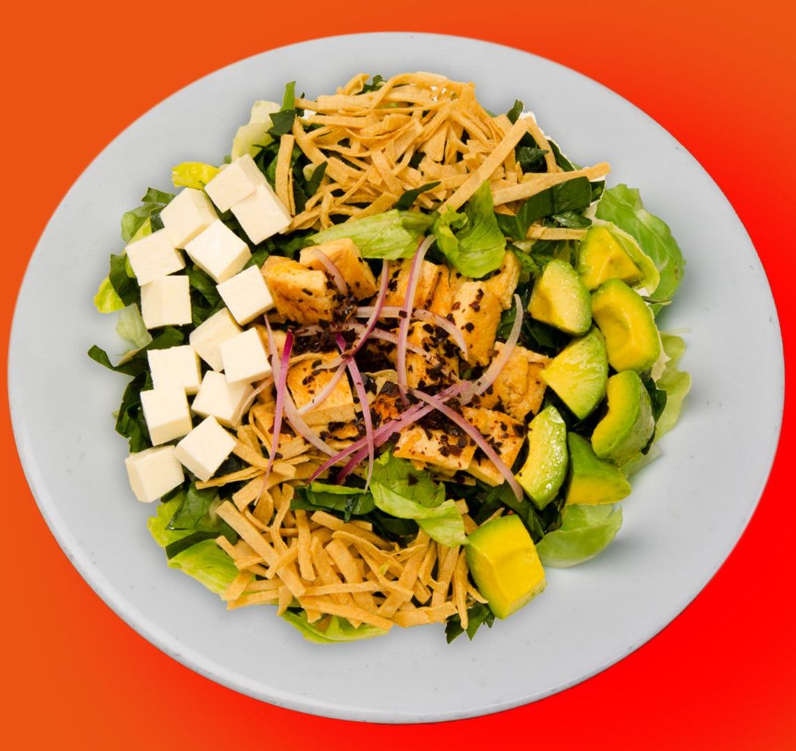 Ensalada con lechuga, espinaca, cebolla, aguacate, tortilla, panela y chile ancho con pollo; Aderezo de la casa