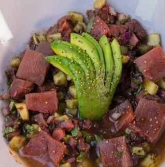 Lomo de atún aleta amarilla de Mazatlán cortado en cubos y servido en crudo, equilibrado con pepino y cebolla morada, todo salseado con una suave mezcla de nuestros jugos negros. Porción: 300 g.