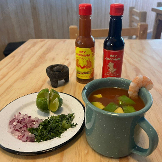 Taza de caldito con camarón y verduritas. Se acompaña con su jardín (cebolla, cilantro y aguacate).