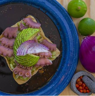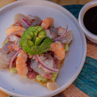 Pulpo, camarón crudo y láminas de atún. Acompañados de pepino, cebolla morada, pimienta negra y aguacate.