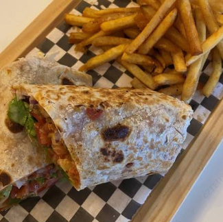 Tortilla de harina gigante con una cama de frijoles puercos, queso , crema, ensalada y proteína de su elección con guarnición de papas a la francesa.