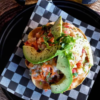 Guisado de pescado en tortilla frita, acompañada de aguacate, cebolla morada, cilantro y su rajita de mayonesa de chiltepin.
