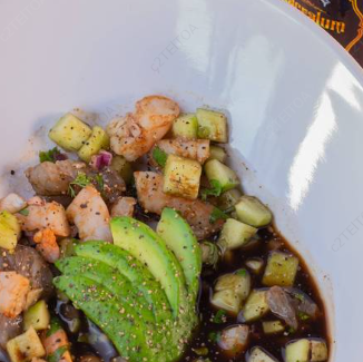 Mejunje de camarón crudo, camarón cocido, pulpo, callo de almeja y atún en un salseado negro de chiltepin del Valle del Yaqui en Sonora. Porción: 400 g. Picor: medio.