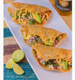 El pedido por lo clientes, tortilla de maíz con frijoles puercos , queso manchego y proteina a elegir adornada con su cebolla curtida, aguacate y mayonesa de la casa.