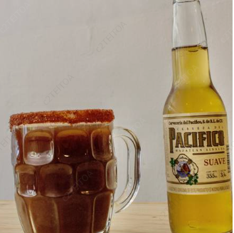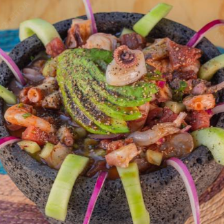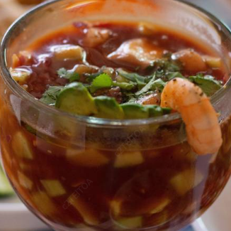Camarón crudo y cocido, pulpo y callo de almeja, pico de gallo, cebolla morada y pepino, un toque de cilantro; bañado en jugo de tomate y almeja al estilo del norte de Sinaloa. Porción: 300 g.