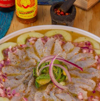 Pesca del día curtida en jugo de limón mexicano, mezclado con jitomate, cebolla blanca y zanahoria, con un toque de cilantro, todo sazonado con sal de Colimense. Porción: 300 g.