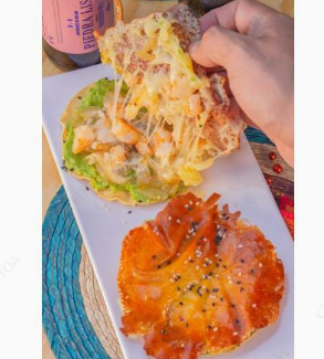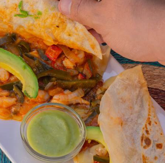 El tradicional taco gobernador, pero más bueno. Camarón, queso, chile poblano, cebolla y jitomate. Sazonado con ajo y pimienta sobre tortilla de harina.