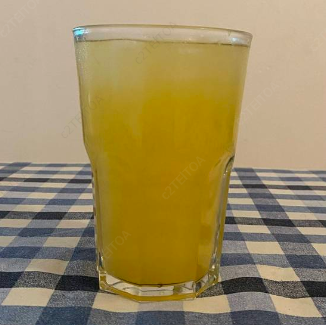 Fresca bebida de naranja servida con agua natural o mineral endulzada con jarabe.