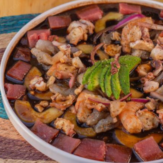 Molcajete generoso de camarón crudo, camarón cocido, atún, pulpo y callo de almeja; bañado en nuestra salsa negra con un toque suave de chiltepín. Porción: 400 g. Picor: bajo.