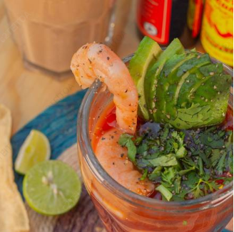 A nuestro estilo, ni muy jarocho ni muy noroeste. Camarón cocido, pepino, cebolla morada, cilantro, aguacate; bañados en salsas de tomate, anguila, hierbas y almeja.