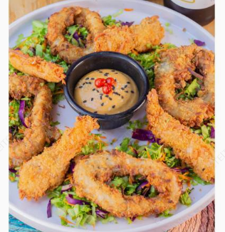 Aros de calamar y camarones capeados en crujiente con coco, sobre una cama de verdurita y aderezo de chiltepin y chipotle.