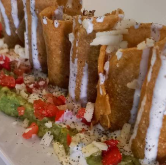 Tacos dorados de Jaiba servidos sobre una cama de guacamole de la casa y espolvoreados de queso manchego.