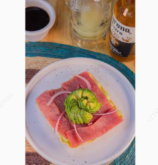 Láminas de atún aleta amarilla del pacífico. Acompañadas de pepino, cebolla morada, aguacate, pimienta negra.