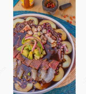 Famoso caldo de las costas del Pacífico, cargado con todos los poderes, gratinado y con su aguacatito (pescado, calamar, pulpo, almeja, callo, camarones , jaiba ).