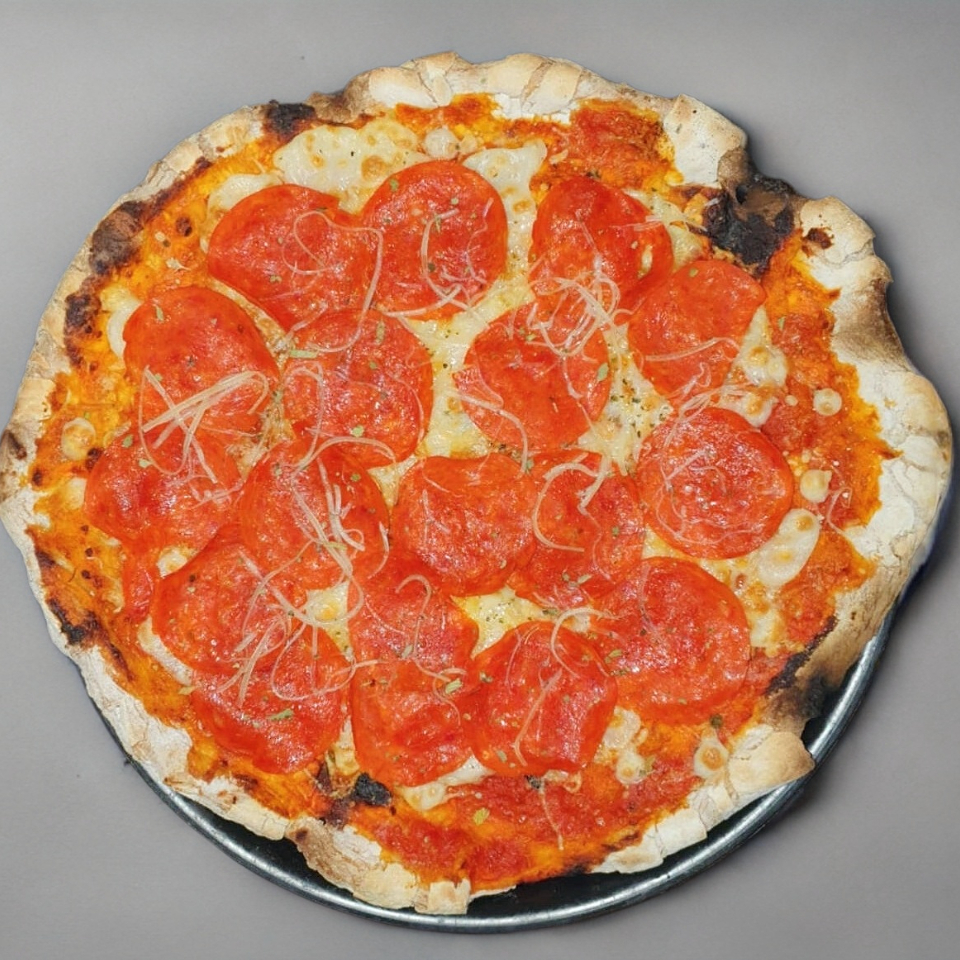Pizza de 35 cm echa en horno de piedra, salsa de tomate, mozarella, pepperoni, acompañada con salsa especial de la casa.