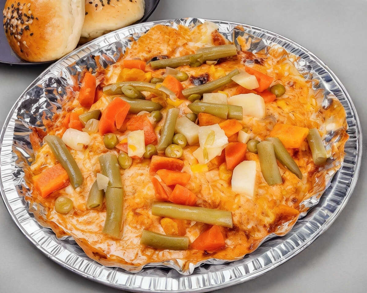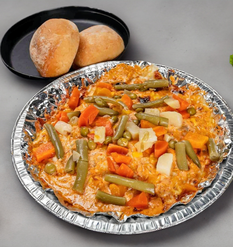 Mezcla de verduras cocidas, crema de chipotle o crema natural, queso gouda y 2 bollos.