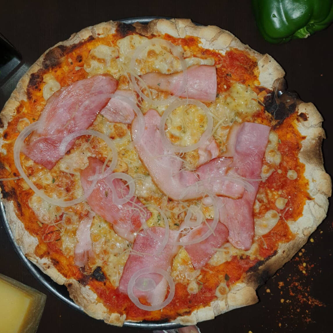 Pizza de 35 cm echa en horno de piedra, salsa de tomate, mozarella, cebolla morada, tiras de tocino, acompañada con salsa especial de la casa.
