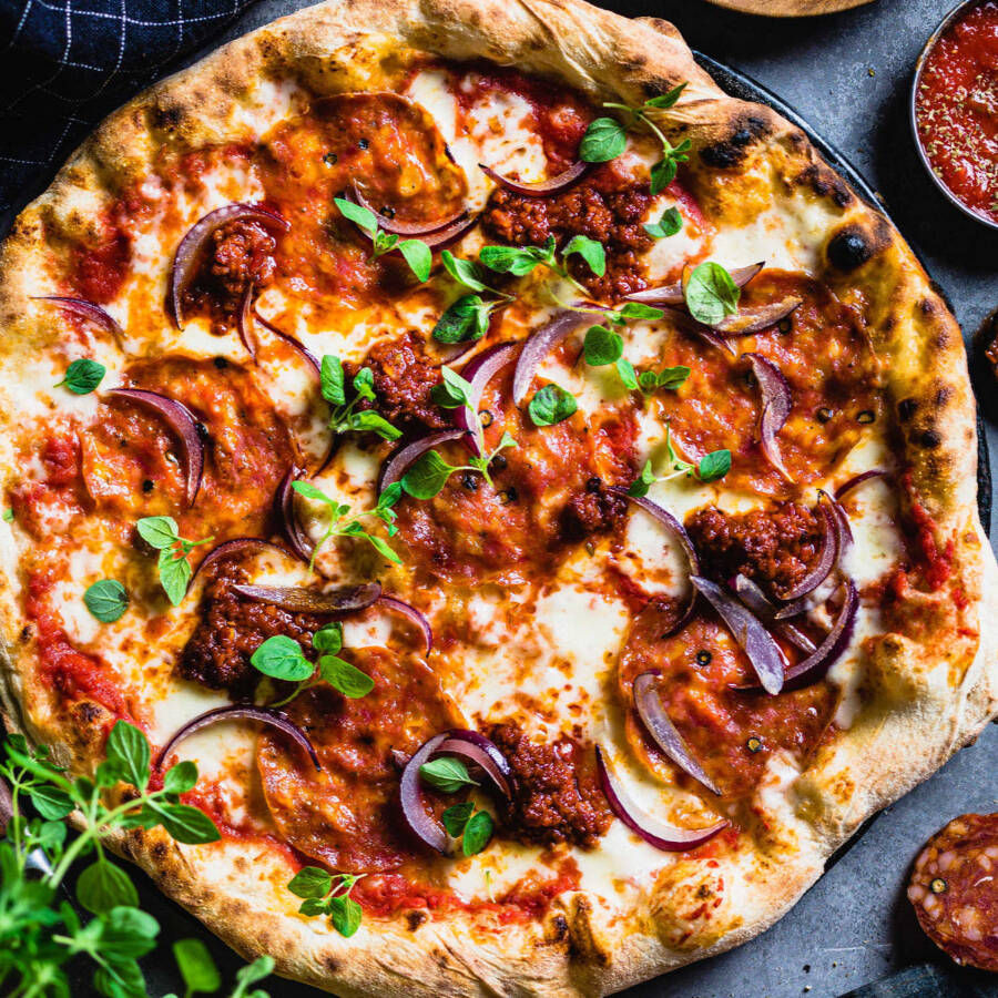 Pizza de 35 cm echa en horno de piedra, salsa de tomate, mozarella, cebolla morada, tocino, peperoni y un toque de chorizo, acompañada con salsa especial de la casa.
