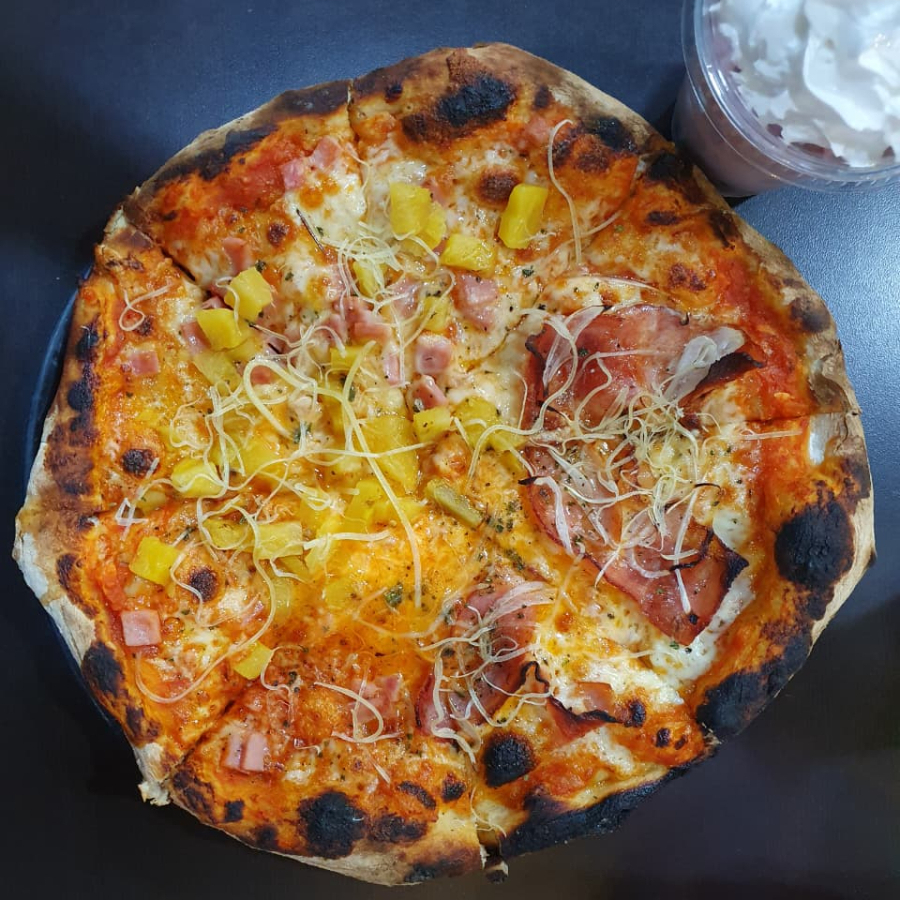 Pizza de 35 cm echa en horno de piedra, salsa de tomate, mozarella, tiras de jamon de pierna y piña, acompañada con salsa de la casa.