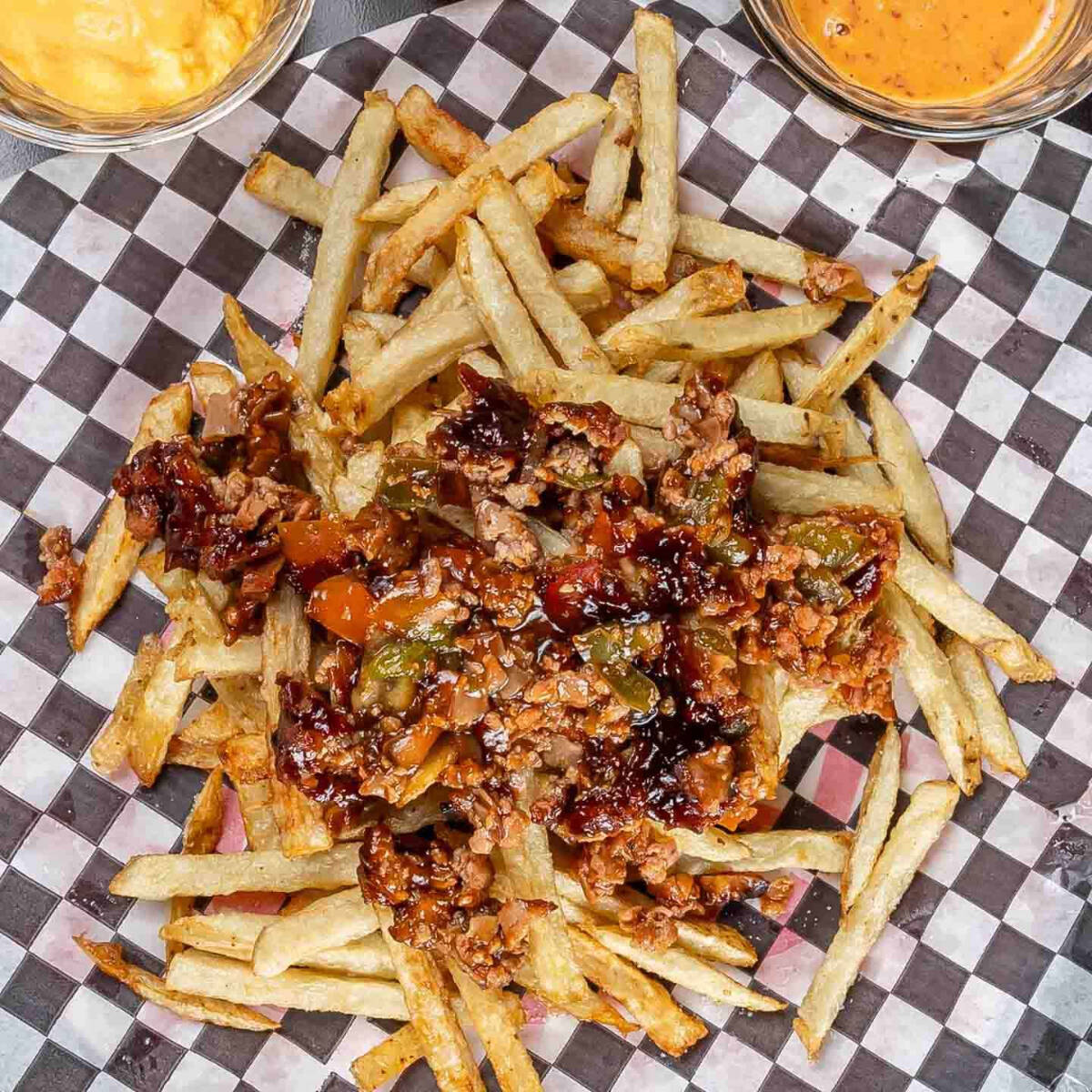 Papas Gajo 250 gr acompañadas con deliciosos queso fundido, tocino crujiente y nuestra salsa picante especial.