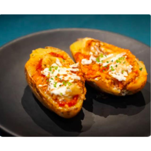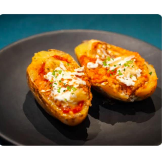 Papa al horno con Bolognesa, crema, cebollín y nuestro queso mozzarella, sin duda, un clásico