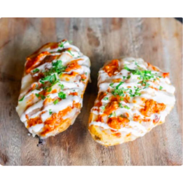 Papa al horno con jamón york, champiñones salteados, cebollín, queso mozzarella y crema, ¡El preferido de nuestros clientes!